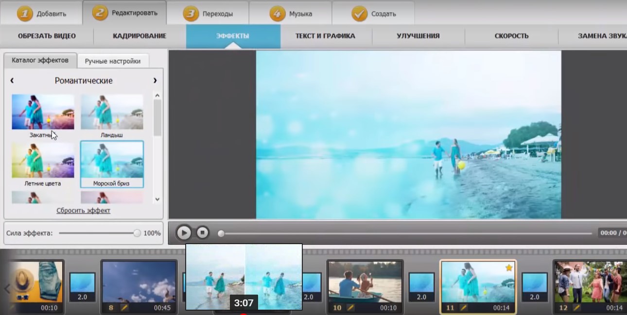 Video MONTAGE attire par sa simplicité, il suffit de cinq étapes pour créer un clip. Téléchargez des sources dans le projet, modifiez-les, effectuez des transitions, ajoutez de la musique et enregistrez le résultat. Dans ce cas, l'enregistrement d'origine peut être considérablement amélioré, jusqu'à un changement radical de l'image.