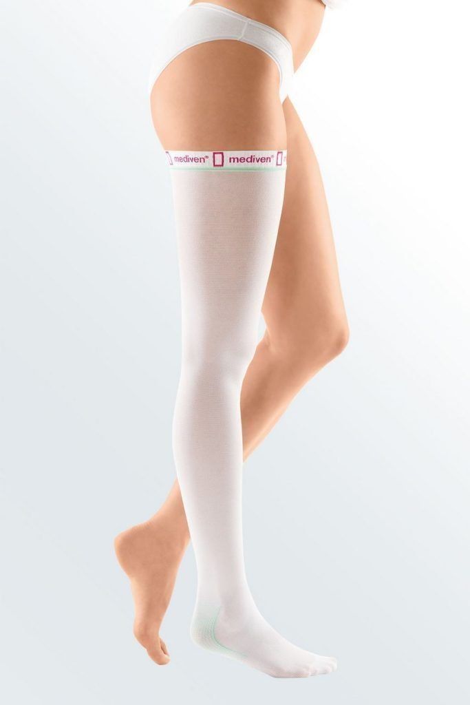 Pour un bon ajustement à la surface de la peau, ces bas ont une bande élastique spéciale dans la partie supérieure. Cela vous permet de fixer solidement le produit sur la jambe. Le matériel médical est composé de 72 polyamide et 28% élasthanne. Il est recommandé d'utiliser ce modèle pour les patients qui sont en position allongée pendant une longue période. Il convient de les utiliser lors de l'accouchement, ainsi que lors de certaines opérations.