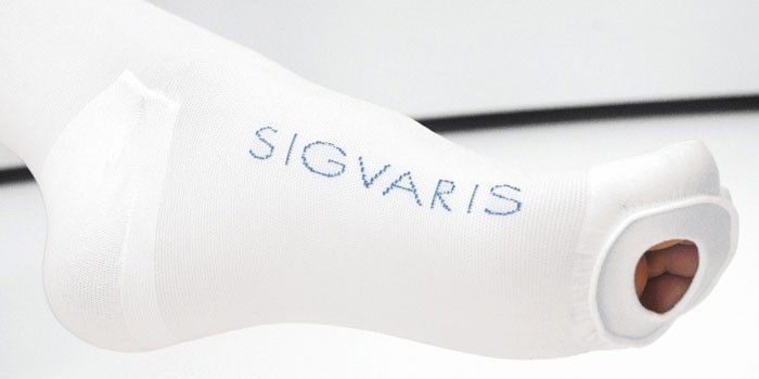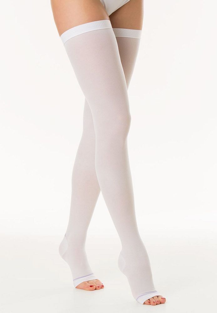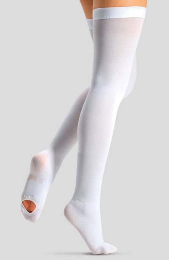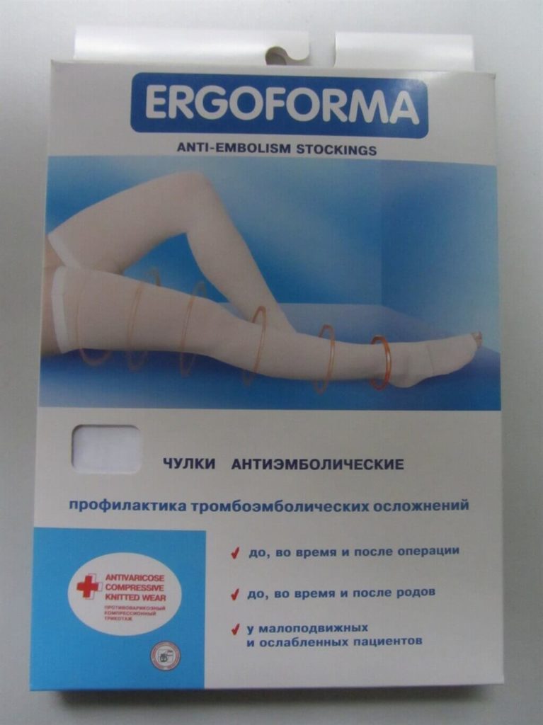 Ces bas ont une couleur blanche traditionnelle pour ce type de produit. La composition du tissu comprend 74 % de polyamide et 26 % d'élasthanne. Ils doivent être portés pour prévenir les complications thromboemboliques. Pour contrôler la circulation sanguine et prévenir le développement d'une infection fongique, un trou spécial est prévu dans la zone des orteils sous les doigts. Pendant le port de ces bas, de l'air est fourni à la peau du patient, ce qui évite la surchauffe.