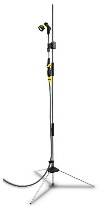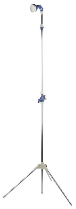 Coût : 1472 roubles. En trois sections, il est composé de trois parties, qui sont pliées en une structure finie. Pèse 300 grammes. Fabriqué en aluminium, résistant à la corrosion. La force de pression peut être ajustée. La conception est préfabriquée, la hauteur n'est pas réglable : 2,17 mètres. Il y a un pic pour l'installation dans le sol. À l'aide d'un robinet, la pression de l'eau est régulée.
