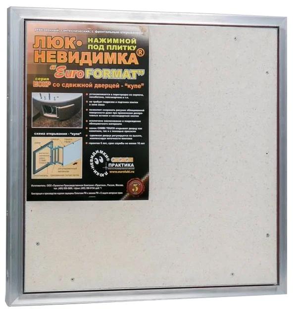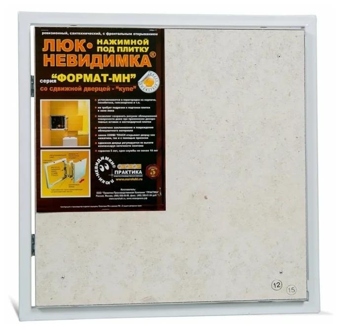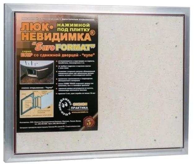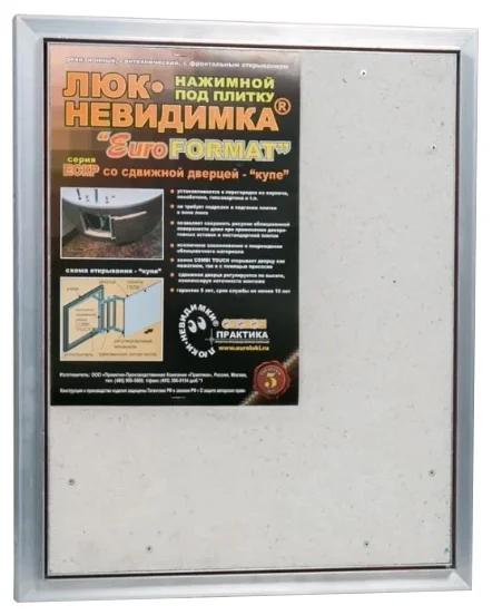 Mur, sous la tuile, au prix de 5091 roubles. Poussez ouvert avec des serrures magnétiques. Fabriqué en aluminium, porte en fibre de gypse. Scellant disponible. Complet avec instructions, passeport, clés hexagonales et ventouse. Il a une largeur de 50 cm, hauteur - 40, profondeur - 4,5 cm.Le produit pèse près de 6 kg, supporte une charge sur la porte de 5 kg. Convient pour une installation près des tuyaux de salle de bain, des compteurs d'eau, des robinets et des filtres.
