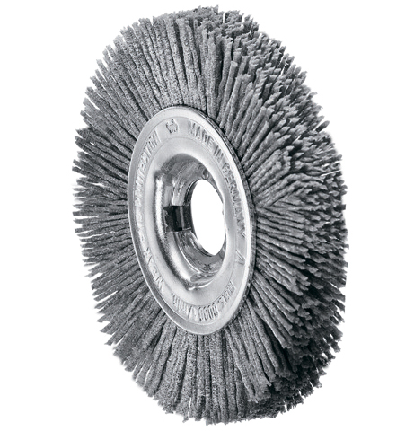 Les modèles appartenant à ce groupe sont destinés à l'étape intermédiaire de brossage, qui consiste à poncer les surfaces et à les préparer pour le polissage final. Les brosses de cette catégorie utilisent des fibres de polyamide (synthétique) avec des poils abrasifs. Les produits peuvent être présentés à la fois sous la forme d'outils à main séparés et d'accessoires pour meuleuses d'angle, perceuses et meuleuses d'angle.