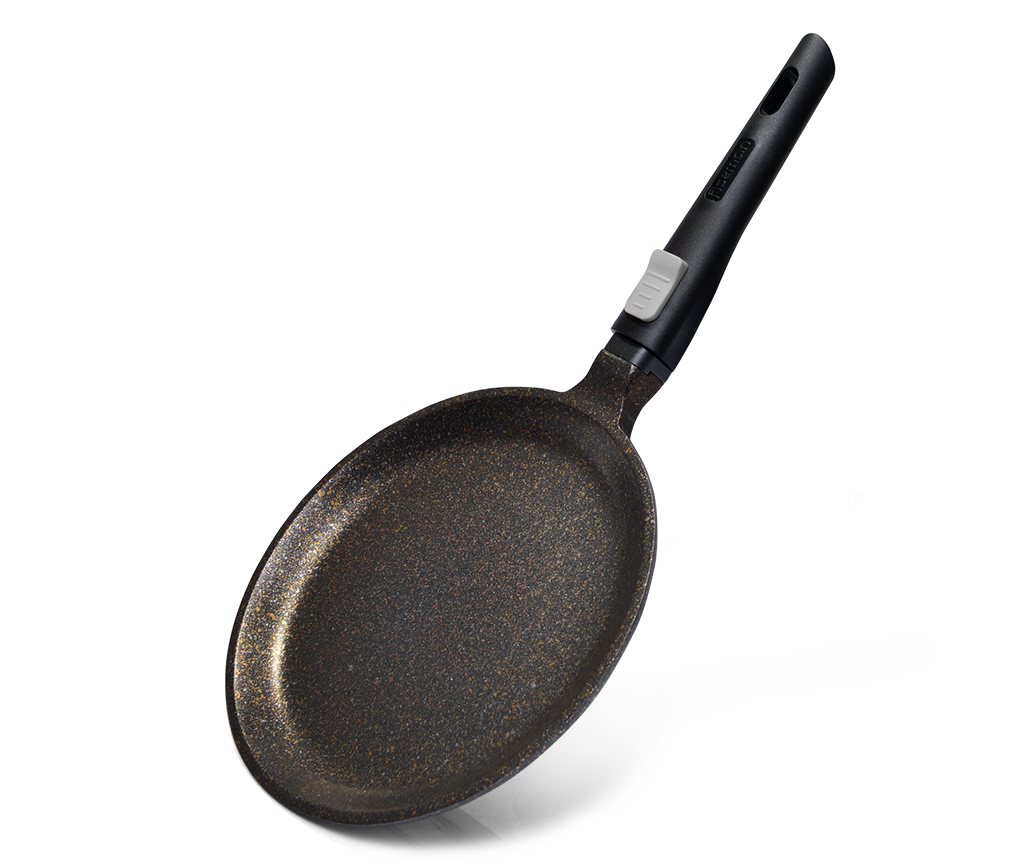 Les ustensiles de cuisine revêtus de titane sont récemment devenus populaires et en demande. Malgré le fait que le titane appartient aux métaux légers, il est très résistant et possède des propriétés anti-corrosion. La poêle à frire est en titane et pèse peu, pratique à utiliser et à faire des crêpes.