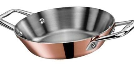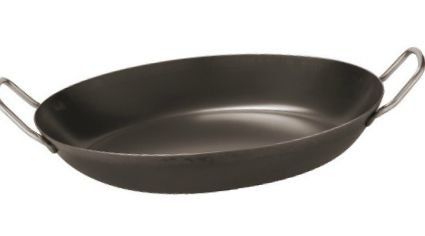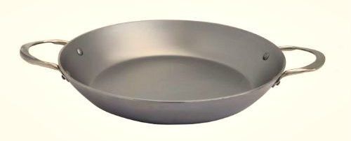 La marque française De Buyer présente une poêle à frire professionnelle d'un diamètre de 32 cm pour la cuisson de la paella et du risotto. Il est fabriqué en acier inoxydable et recouvert de cire d'abeille. Le matériau de la poignée est en tôle d'acier.