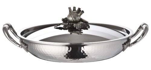 Une poêle à paella incroyablement belle plaira aux connaisseurs non seulement de praticité et de qualité, mais aussi d'un beau look printanier. Le principal "point fort" du produit est le travail de conception avec la marque du maître sous la forme d'une poignée en laiton argenté inhabituelle, située sur le couvercle.