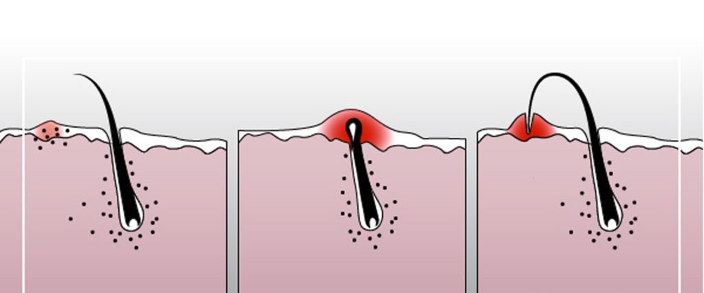Lorsque le follicule pileux est déplacé, les poils peuvent littéralement pousser dans la peau, formant une boucle à la surface. Dans ce cas, l'inflammation est plus forte et seul un dermatologue peut résoudre le problème. Pour soulager les démangeaisons, vous pouvez utiliser une lotion aux acides AHA, qui éliminent en douceur les cellules mortes de la peau et hydratent la peau.