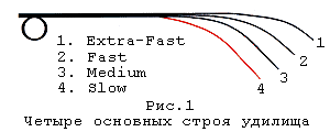 Moyenne (parabolique). L'action la plus polyvalente, très appréciée des pêcheurs. La courbure de l'équipement ressemble à une parabole.