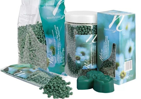 White Line Natura Azulene est une cire granuleuse idéale pour épiler la zone du maillot, les bras et les jambes. Ce sera bon même pour les peaux sensibles avec des poils grossiers qui ne veulent pas éclater. C'est une goutte dure, ovale et inodore. Les granulés fondent rapidement, faites-le au bain-marie.Appliquez une fine couche de produit sur la peau préparée, lissez-la si nécessaire et en 10 secondes, elle durcit. Pour déchirer la couche, soulevez soigneusement le bord du film et, sans oublier de soutenir la peau, faites une secousse contre la croissance des poils. Après la procédure, afin d'éviter les rougeurs, la chlorhexidine peut être appliquée sur la peau.