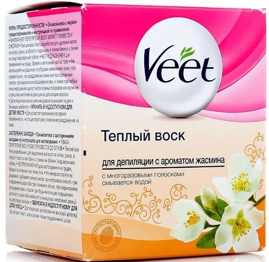 En étudiant la popularité des modèles de produits d'épilation, il est impossible de ne pas noter Veet Warm Wax. Sur le territoire de notre état, c'est l'un des produits d'épilation les plus populaires. L'ensemble contient un pot de cire d'un volume de 250 ml, une spatule avec un indicateur de température et 12 bandes de tissu réutilisables. Cela signifie que vous n'avez pas besoin d'acheter quoi que ce soit de plus. Étant donné que les bandes sont réutilisables, après utilisation, lavez-les, séchez-les et vous pourrez les utiliser en toute sécurité. Pour l'utilisation, la cire est chauffée au micro-ondes à une température confortable. Pour voir si c'est trop chaud, mettez de la cire sur une spatule et touchez la peau. Pendant l'utilisation, appliquez le produit pour la croissance des cheveux, lissez la bande le long de la jambe et arrachez-la d'un coup sec contre la croissance des cheveux. Les résidus du produit sont facilement lavés à l'eau.