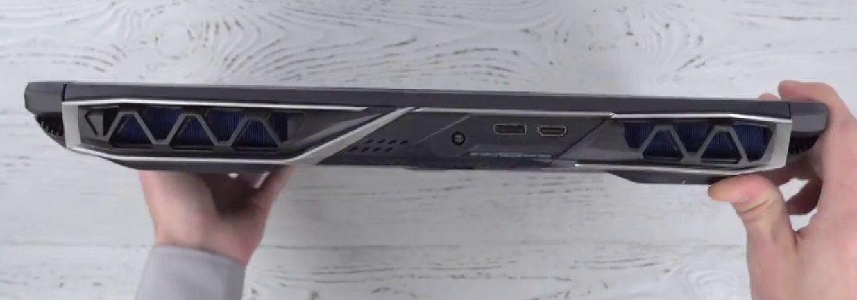 Sur la face arrière, les constructeurs ont placé un connecteur de charge, des sorties vidéo HDMI 2.0 et DisplayPort. L'absence d'un lecteur de carte, dont la présence facilite et accélère la copie de fichiers, n'est pas claire.