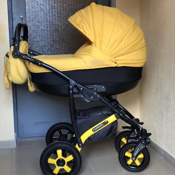 Les blocs peuvent être déplacés vers l'avant ou vers l'arrière comme vous le souhaitez. Le berceau est profond et spacieux, le bébé en vêtements d'hiver y sera à l'aise, pas encombré. Ceintures de sécurité - à cinq points, avec des coussinets souples contre les frottements. Livré avec moustiquaire, habillage pluie, chancelière, sac maman.