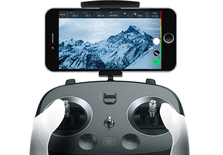 Lors du contrôle d'un quadricoptère, il est très pratique d'utiliser un smartphone. Vous devez y installer l'application XIRO XPLORE et vous pouvez voir directement la zone environnante à travers les yeux du drone. La diffusion se fait en Wi-Fi en qualité HD 720. Il y a ici une petite nuance. Malheureusement, le support de téléphone est conçu pour un petit appareil. Si le smartphone a une diagonale d'écran supérieure à 5,5 pouces, il se peut qu'il ne rentre tout simplement pas dans le support.