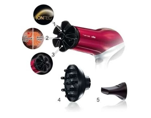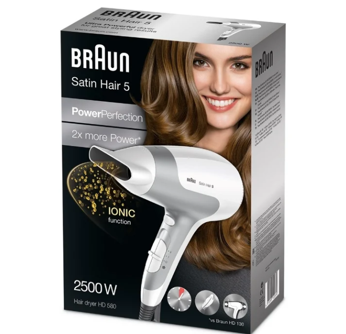 - C'est un bon appareil électroménager à usage individuel. D'une puissance maximale de 2500 watts, il dispose d'une option d'ionisation automatique de l'air qui diélectrique les cheveux et leur donne une brillance saine.De plus, le Braun HD 585 dispose d'un bouton séparé pour allumer l'alimentation en air froid, et le revêtement en céramique de l'élément chauffant empêche les cheveux de surchauffer. Trois modes de chauffage et deux vitesses d'intensité du flux d'air.