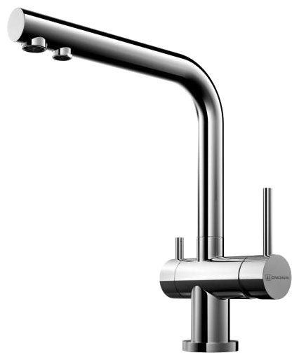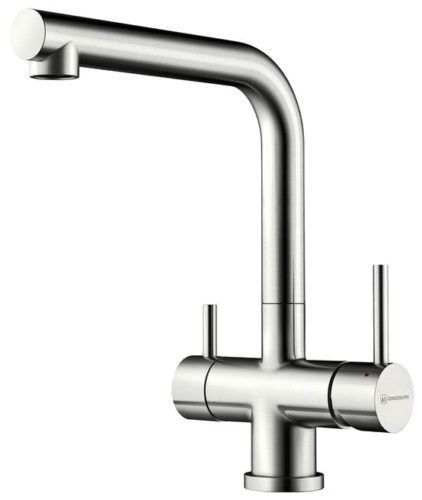 Le mitigeur monocommande à cartouche céramique est en acier inoxydable avec la même finition. Après avoir nettoyé et appliqué un liquide spécial, le robinet de la cuisine brillera comme neuf. Le matériau anti-corrosion durera longtemps, mais n'est pas à l'abri de petites rayures en cas de mauvaise utilisation et de mauvais entretien. L'installation horizontale sur l'évier et deux interrupteurs - pour l'eau du robinet et l'eau filtrée - vous permettent de ne pas installer de robinet séparé. Le bec traditionnel en forme de L facilite le lavage de la vaisselle dans un évier de toute forme. La hauteur du robinet vous permet de laver petits et grands plats sans trop d'effort. Le robinet peut être installé sur la salle de bain et dans le lavabo large. Ergonomie bien pensée. La commodité et la polyvalence sont déterminées par le prix élevé du produit.