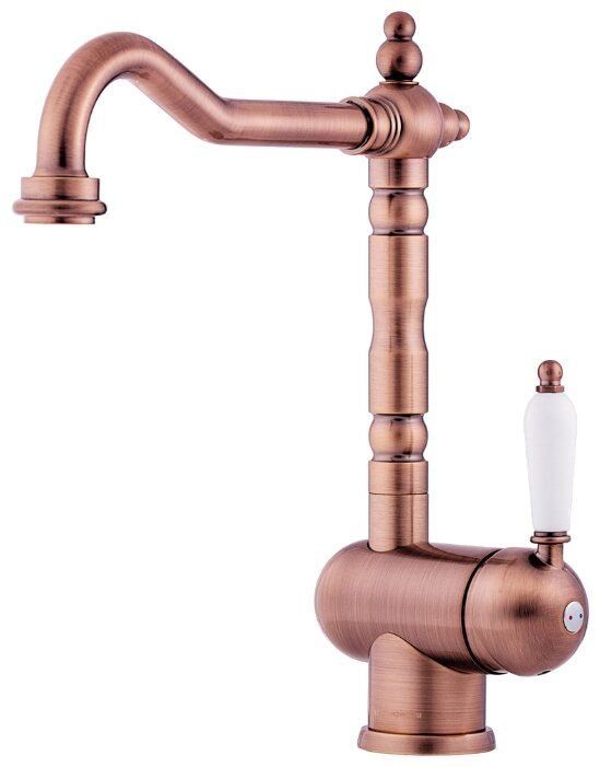 Modèle avec une poignée - levier, sans passer à un filtre à eau. Fabriqué dans un style rétro. Le corps en laiton plaqué bronze durera longtemps s'il est manipulé avec soin. Le bec est pivotant. Le mélangeur est équipé d'une fonction supplémentaire pratique - un bec rétractable. Cette conception résout le problème des éclaboussures sur les parois de l'évier et autour de celui-ci lors du lavage de la vaisselle et des produits. Ce type de robinet peut être utilisé dans le lavabo et dans la salle de bain.