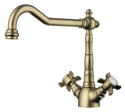 Robinet à double levier avec forme de bec traditionnel. Chaque vanne est responsable d'une eau spécifique (chaude et froide). Matériau du corps - laiton avec finition laiton antique. Un modèle classique avec une apparence majestueuse. L'absence de thermostat et de mode éco ne le rend pas moins populaire. Le robinet peut être monté horizontalement sur une baignoire ou un lavabo, comme la plupart des produits similaires. Le bec est livré avec une buse d'aération. La bonne longueur du bec vous permet d'obtenir un grand évier de toute forme.