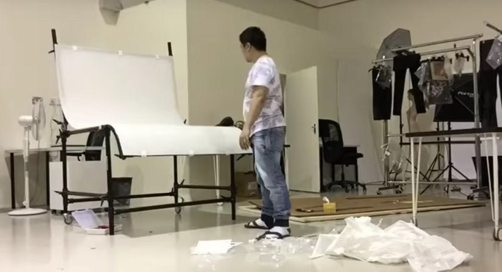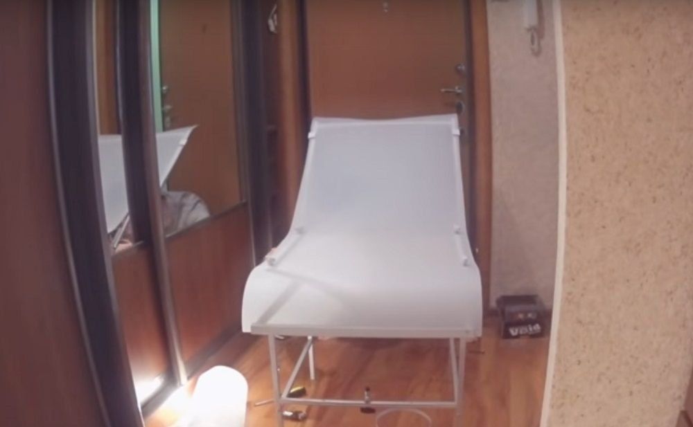 Table robuste et mobile pour la photographie de produits. La première chose qui attire votre attention est le matériau de qualité à partir duquel le comptoir est fabriqué. La toile de chlorure de vinyle enduite mate ne forme pas d'éblouissement et ne déforme pas la couleur lorsqu'elle est allumée. C'est remarquable, mais la toile peut être à la fois réflecteur et diffuseur. Dense, élastique et résistant à l'usure.