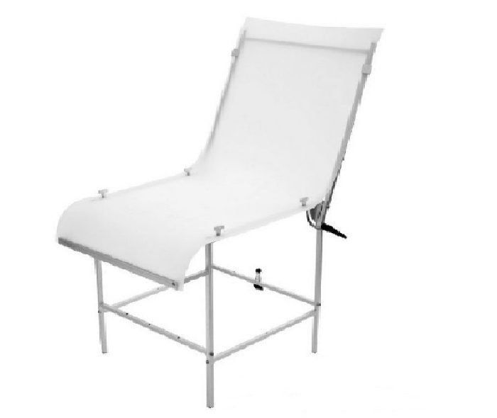 La toile est en plastique dur et élastique avec une texture uniforme et uniforme. Grâce à cela, les objets se tiennent en toute confiance dessus, ne glissent pas et ne tombent pas. Ceci est important pour les produits coûteux et fragiles. Des revêtements de fond et des matériaux de différentes couleurs peuvent être utilisés. Ils sont facilement attachés à des pinces à linge. La table est facilement réglable, la plage d'angle est de 0 à 90 degrés.