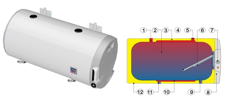 Par type d'installation, il est posé au sol. L'intérieur du réservoir est recouvert d'une couche d'émail. Une anode en magnésium est installée dans le système et la couche d'isolation thermique est de 40 millimètres. Le temps de chauffage du liquide est d'une demi-heure. Le coût de l'appareil de chauffage varie de 25 à 50 000 roubles.