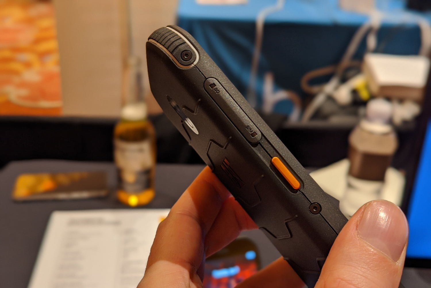 Sur le côté gauche du smartphone se trouvent le bouton d'alimentation et les touches de volume. Sur le côté droit, il y a une touche qui peut être configurée pour diverses fonctions. Il peut être personnalisé pour n'importe quelle tâche. Sur le côté droit, il y a un emplacement pour une carte SIM et une carte mémoire.