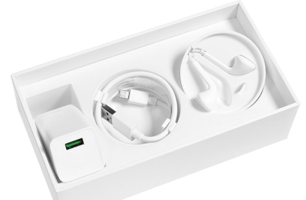 Il est livré dans un emballage assez volumineux, qui comprend le smartphone lui-même, un casque, un câble Micro USB (longueur de cordon standard), un chargeur avec prise en charge de la charge rapide VOOC Flash : tension 5 volts, courant 4 ampères, étui en silicone et une carte SIM éjecter l'aiguille.