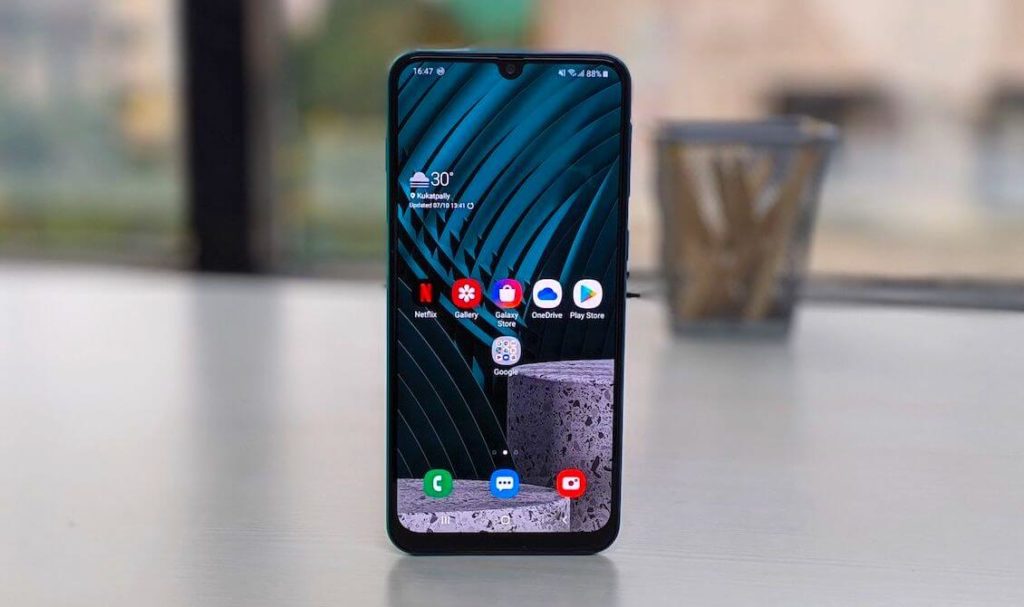 Sans fioritures, simple et minimaliste. Presque identique au modèle M30s. Le même grand écran de 6,4 pouces avec une encoche en forme de U pour la caméra selfie, la soi-disant Water Drop Notch. Lunette noire mince, coins arrondis et corps en plastique. Le "menton" rétréci en bas n'irrite pas et n'interfère pas avec l'examen. La génération Gorilla Glass 3 de Corning résiste aux dommages mécaniques et aux rayures.
