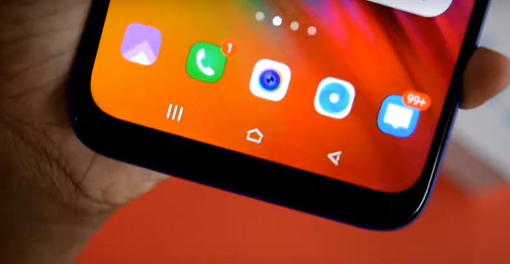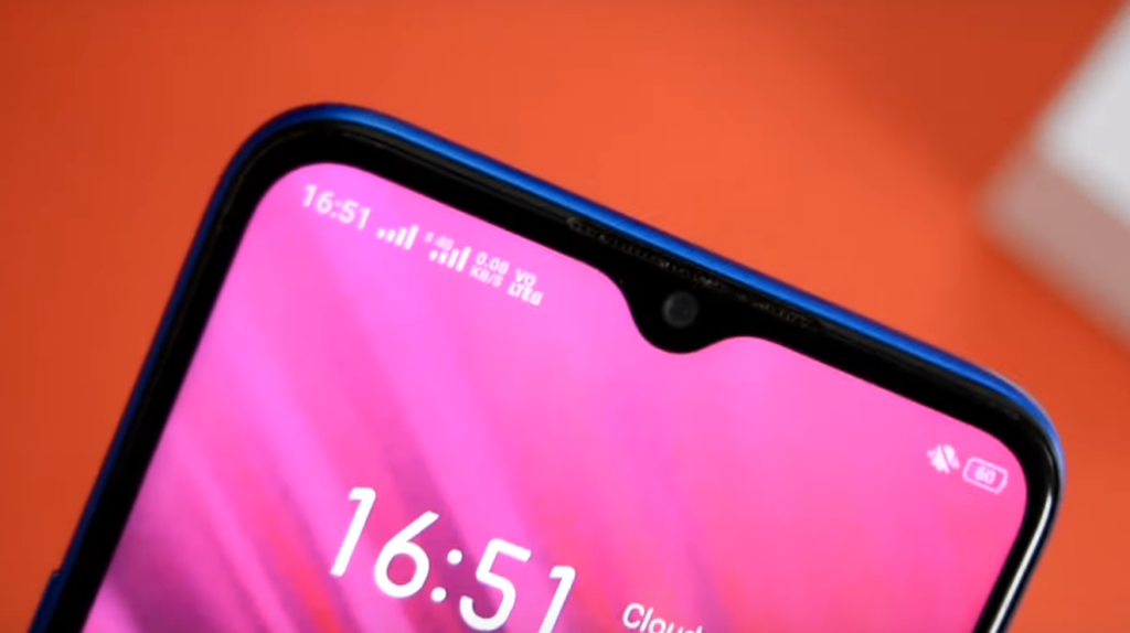L'avant du smartphone a un grand écran, au-dessus duquel se trouve une découpe de caméra en forme de larme au centre, et un petit coup de menton en bas.