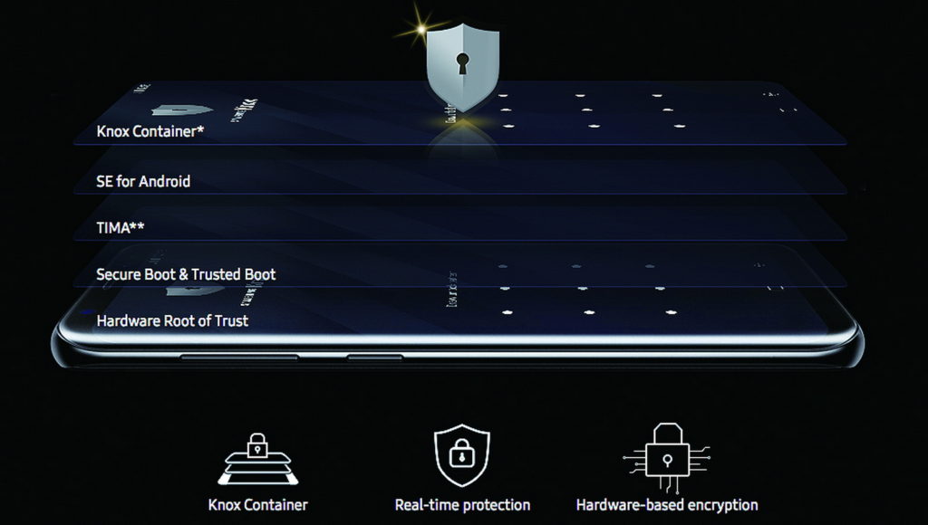 Ici tout est en ordre. Capteur d'empreintes digitales intégré sous l'écran, reconnaissance faciale, plus un code PIN et un motif. Et le Samsung Knox intégré protégera les données personnelles et matérielles de l'utilisateur même lors de l'utilisation du stockage en nuage.