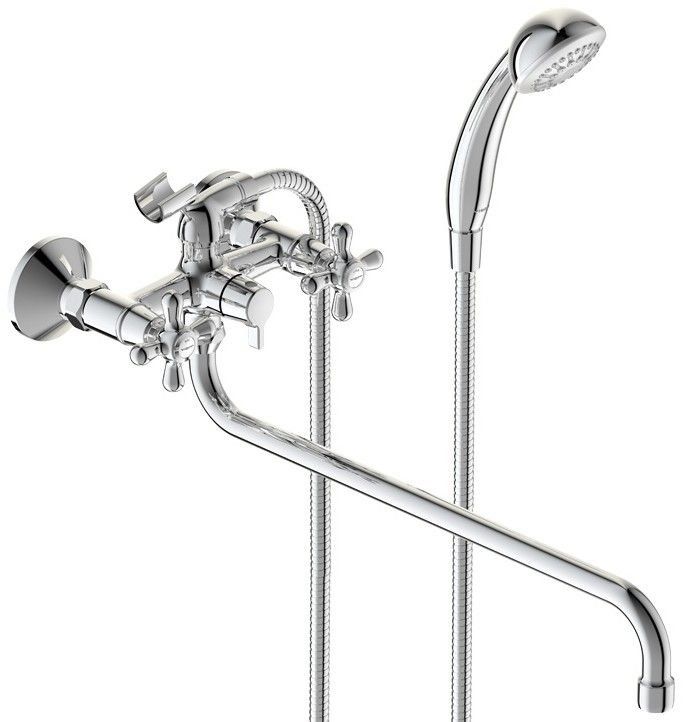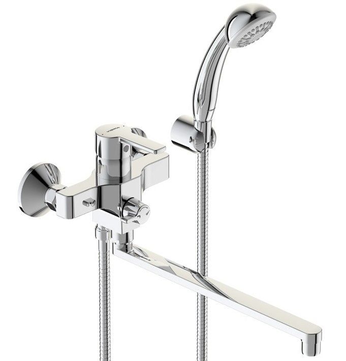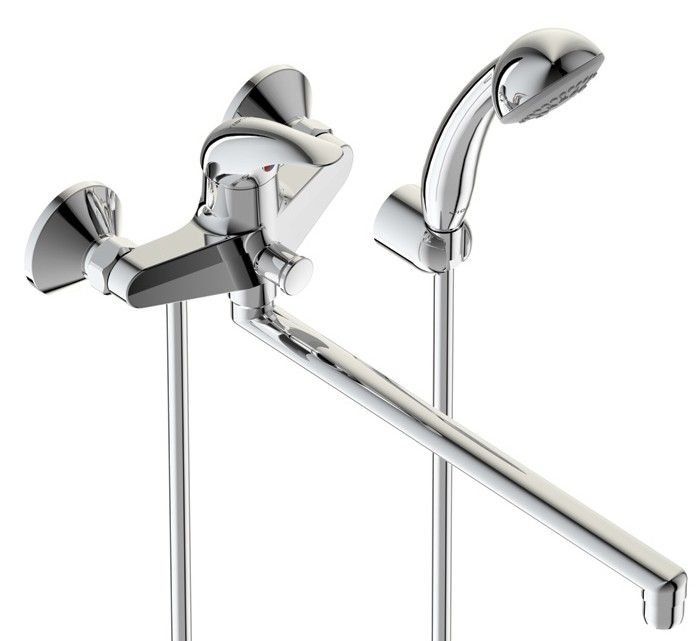 Mitigeur universel monocommande à bec long (32 cm). Le jars est équipé d'un aérateur Perlator. La commutation bain-douche se fait manuellement à l'aide d'un interrupteur en céramique de fabrication allemande. De plus, le mitigeur est équipé d'un système d'économie d'eau.
