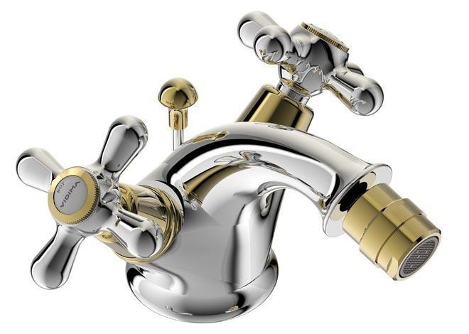 Mitigeur de bidet à deux leviers de style rétro au design bicolore. Le bec en laiton coulé est équipé d'un aérateur anti-vandalisme. Les poignées sont protégées de l'échauffement par le système Comfort Touch.