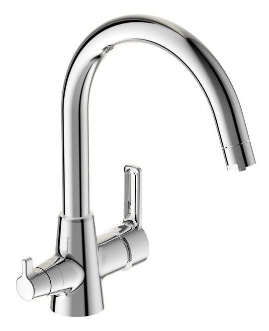 Robinet à double levier avec vannes de forme pratique. La buse d'aération réduit la consommation d'eau et réduit les niveaux de bruit. Le bec pivotant facilite le lavage de grands plats. Le corps est en laiton, plaqué de chrome.