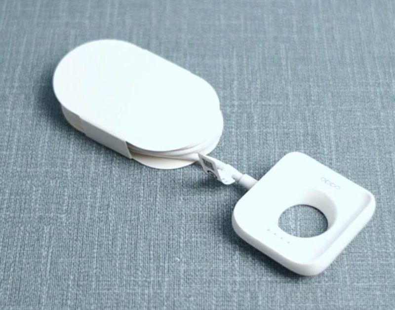 Oppo Watch est livrée dans une boîte blanche, où, en plus de la montre, il y a un manuel d'instructions et une station de charge sans fil.