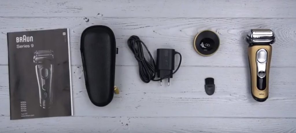 En plus du rasoir électrique lui-même, le kit comprend un étui de voyage, un support de charge, un câble et une brosse de nettoyage.