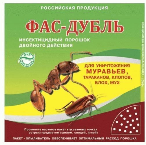 Conçu pour une confrontation vigoureuse avec les insectes de la vie quotidienne : punaises de lit et puces, mouches et cafards. Médicament bon marché, mais très productif. Détruit les parasites et prévient leur apparition dans les 2 mois. L'outil est utilisé en fonction du type d'ectoparasites. Des puces, une fine couche de poudre est appliquée aux endroits inaccessibles de la maison, sur la litière des animaux, les sols. Dépensez environ 2 g pour 1 mètre carré. Le produit chimique détruit les parasites domestiques en 1 heure. La rapidité de la procédure et la fécondité sont les principaux atouts de Fas-Double.