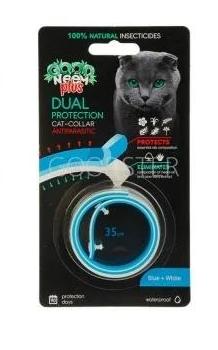Le collier de 35 cm de long convient aussi bien aux chats (à partir de 8 semaines) qu'aux chiots. Il les protège des puces, tiques, moustiques et autres insectes hématophages jusqu'à 3 mois. Le matériau est résistant à l'eau et doté de propriétés pharmacologiques (composition) telles que les huiles essentielles de citronnelle, lavande, arbre à thé, clou de girofle, romarin, eucalyptus, sevilen, huile de neem, extrait d'aloe vera.