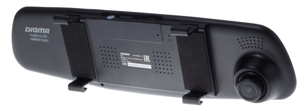 L'unité principale "se dissout" dans le rétroviseur, ou plutôt attachée à celui-ci avec deux attaches en caoutchouc. Les bosses sur la route ne le renverseront pas.Il est difficile pour les étrangers de reconnaître le DVR.