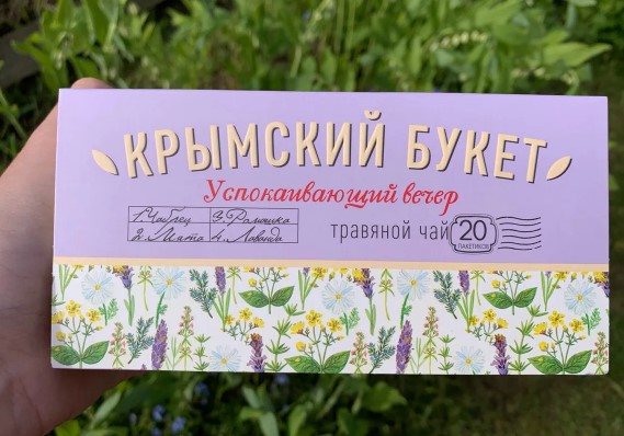 Tisane 100% naturelle sans gluten contenant des herbes naturelles : thym, camomille, lavande et menthe, récoltées dans les lieux protégés de la Crimée, favorise la détente et apaise après une journée bien remplie. Il est recommandé de le boire le soir ou avant d'aller se coucher. La boîte en carton contient un sac en aluminium avec vingt sacs filtrants sans ficelles, soudés par paires. Les sacs sont facilement séparés le long des lignes perforées, mais cela est quelque peu gênant lors du brassage. Mais le coût des marchandises est bien inférieur à celui des analogues équipés de fils et d'enveloppes individuelles. Le contenu des sacs est propre, exempt de poussière et de débris.Les herbes sont excellentes pour la saveur et l'arôme.