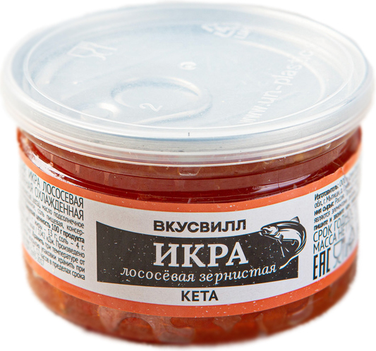 Le produit est complètement prêt à l'emploi. Il est utilisé pour la cuisson de plats chauds et froids, il peut également être utilisé comme plat indépendant. Ne contient que des produits naturels : caviar de saumon granulé (saumon kéta), huile de tournesol désodorisée raffinée, sel alimentaire, acide sorbique (pour la conservation). Prix : 896 roubles.