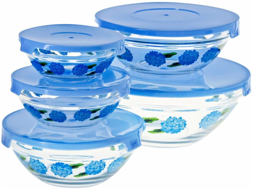 Ensemble de cinq saladiers transparents en verre résistant à la chaleur, décorés d'un motif lumineux en forme de fleurs bleues. Les saladiers sont également livrés avec des couvercles en caoutchouc bleu durable qui, en raison de la fixation hermétique, ne permettent même pas aux produits liquides d'être à l'extérieur. Les parois vitrées sont épaisses et résistantes aux chocs. Le matériau du couvercle n'absorbe pas les odeurs et est facile à nettoyer avec une éponge. Les plats ont une gamme de tailles différente, sont lisses au toucher, la couleur du motif est brillante, même après une longue utilisation, le motif ne s'estompe pas. Convient pour le lavage au lave-vaisselle à n'importe quelle température, ainsi que pour le stockage au réfrigérateur. Il résiste aux changements brusques de froid et de chaleur.