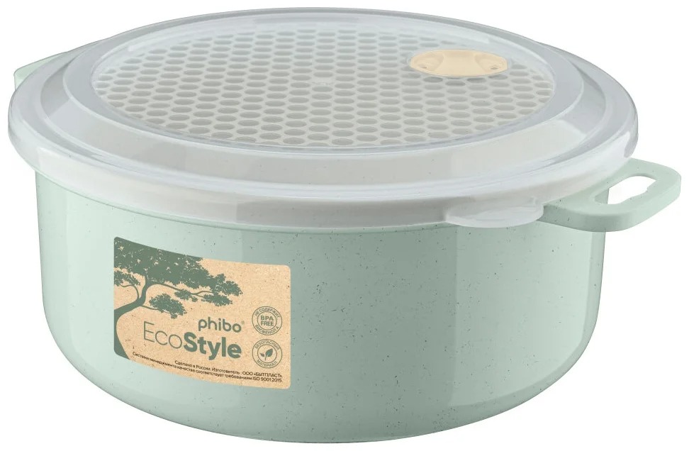Le récipient est en plastique respectueux de l'environnement, il ne fond pas sous l'influence de températures élevées et n'émet pas de fumées toxiques, conservant toutes les propriétés utiles des aliments chauffés. Les poignées sont confortables, fabriquées dans le même matériau pour éviter la surchauffe. Hauteur - 11 cm, largeur du produit - 19 cm.