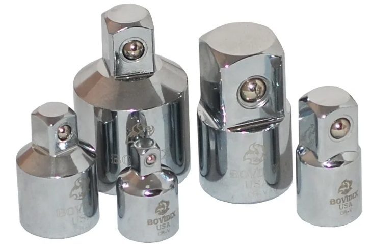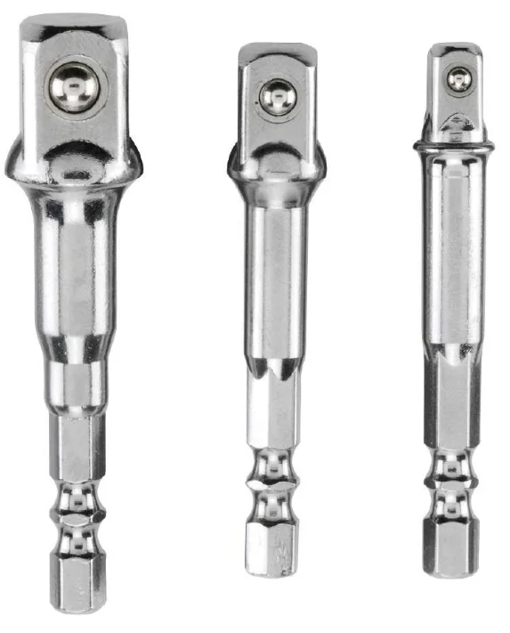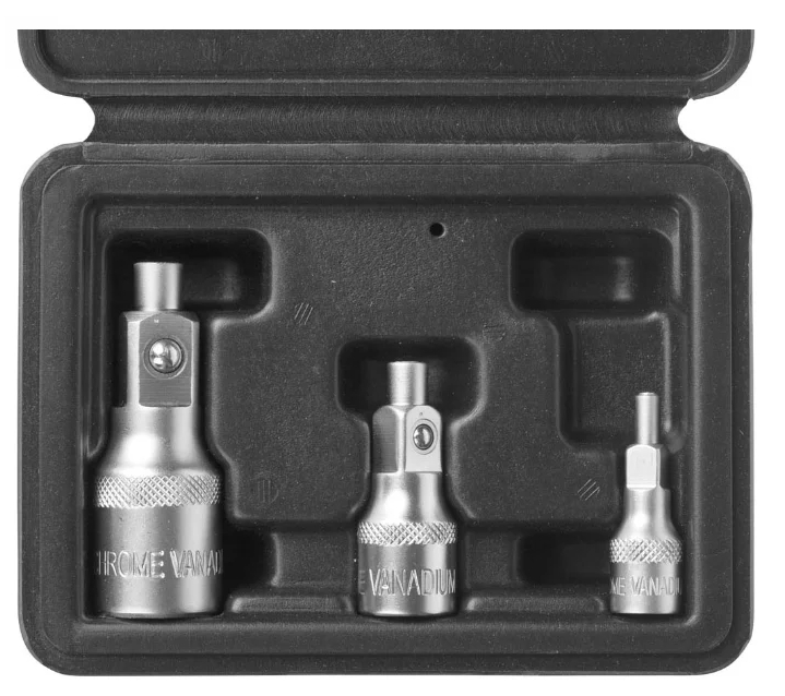 En achetant ce modèle, vous devenez propriétaire d'un ensemble économique d'adaptateurs de haute qualité en acier au chrome-vanadium traité thermiquement. Le carré d'entraînement 1/4″, 3/8″ et 1/2″ est doté d'un cran d'arrêt à bille pour empêcher les têtes de tomber, et ses bords biseautés garantissent qu'ils s'insèrent solidement dans la douille.