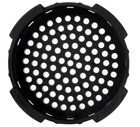 Couvercle en plastique foncé, surface perforée (trous ronds).