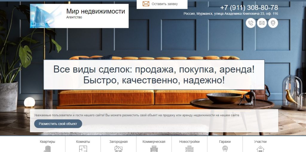 L'agence résout les problèmes liés à l'achat, la vente, la location de locaux non seulement à Mourmansk, mais également à Saint-Pétersbourg, ainsi que dans d'autres régions de Russie.