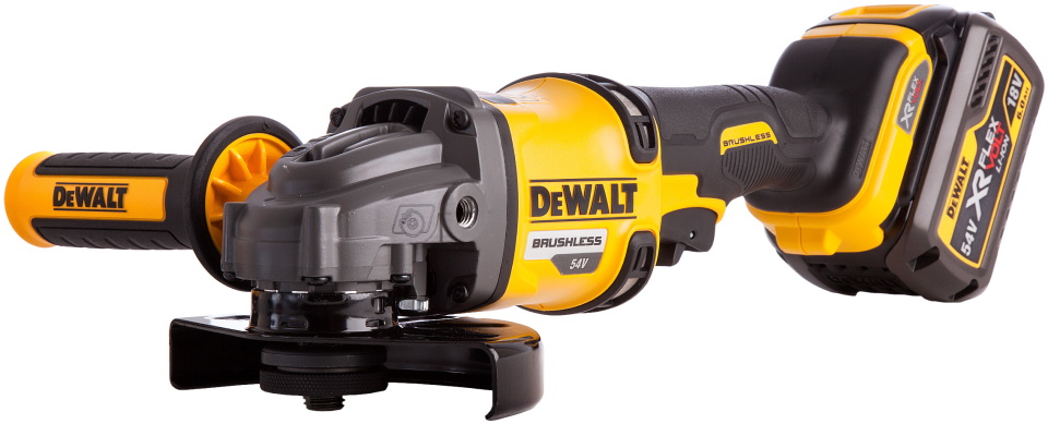 Meuleuse d'angle modèle autonome pour les opérations professionnelles de coupe et de meulage avec du métal ou d'autres matériaux. L'unité avec un diamètre de disque de 230 mm est alimentée par deux batteries 18 V, achetées séparément. L'étui caoutchouté tient confortablement dans votre main. Vous pouvez fixer une poignée supplémentaire à gauche ou à droite pour plus de commodité.