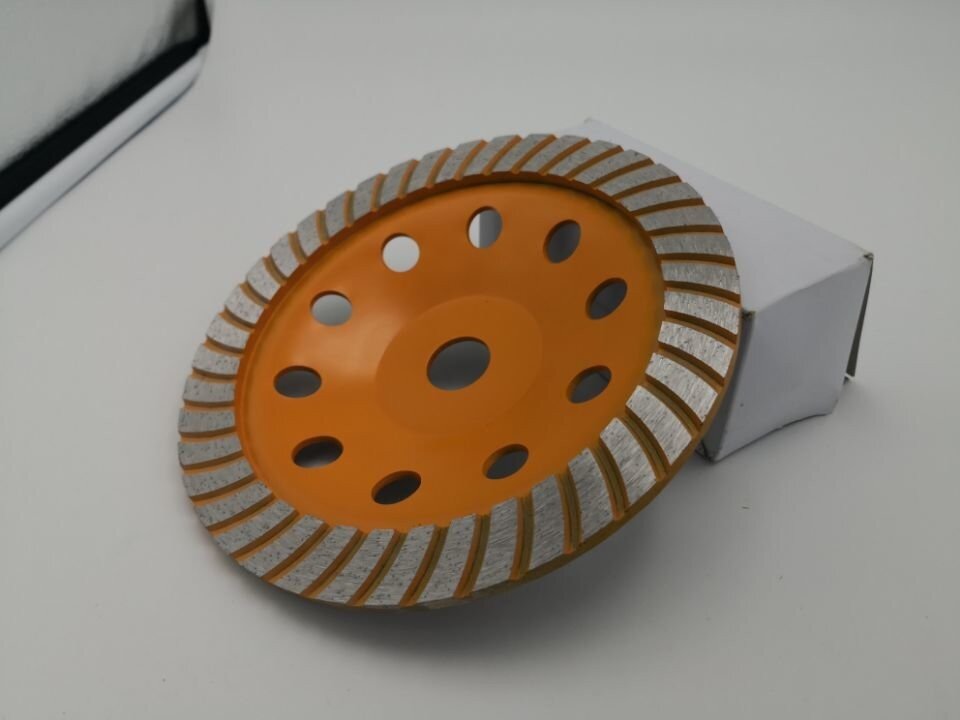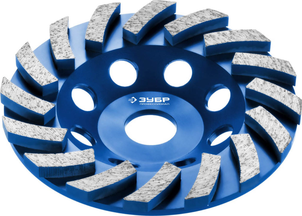 Les éléments en diamant sont montés autour de la circonférence, sur tout le plan de travail. Les fraises sont situées perpendiculairement au sens de rotation du disque. La distance entre eux est minime. De l'extérieur, il ressemble à un cercle plein. L'apparence du gobelet "Turbo" est similaire à celle d'un matériau ondulé. Un grand nombre de segments meulera n'importe quelle surface. Par conséquent, le disque est utilisé pour le meulage fin des plans en béton avec de petites quantités de travail effectuées. Il est également utilisé dans la fabrication de diverses figurines. La buse aidera à polir les coins, les virages, à créer toutes sortes de chanfreins et de bords.