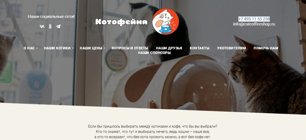 20-25 chats et chats pris au refuge de la ville vivent en permanence. Sur le site pour chaque animal il y a une photo avec une histoire, des habitudes, des traits de caractère. Le ronronnement que vous aimez peut être ramené à la maison.