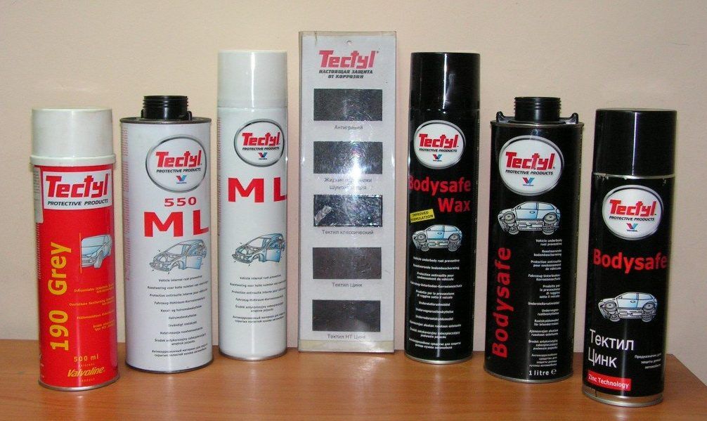 Le constructeur propose un agent bitumineux pour le fond et un spray avec ajout de cire pour les parties cachées. Dans les conditions russes, le produit sans danger pour le corps Tectyl avec du zinc est particulièrement utile.