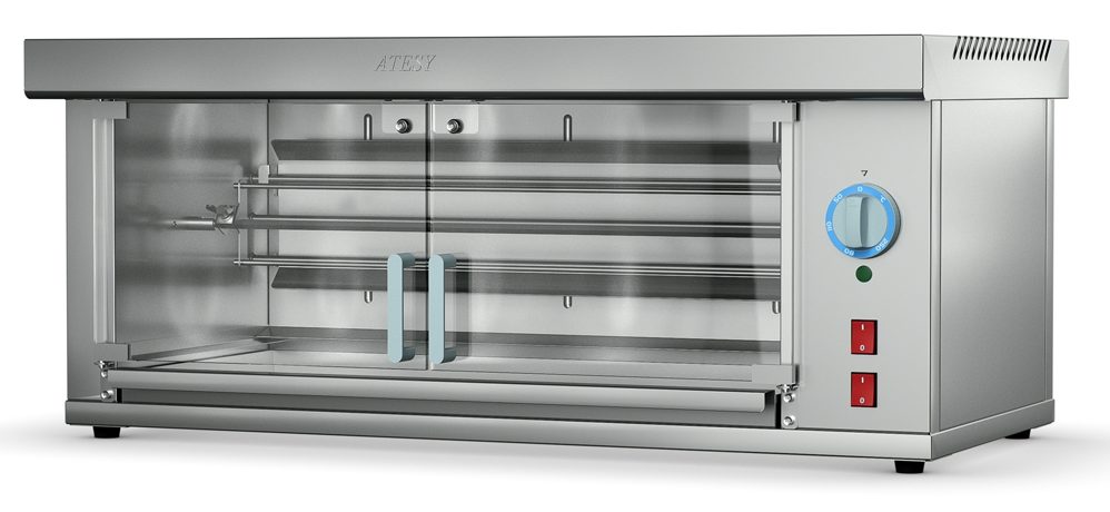 Avec cette machine, vous pouvez cuisiner des cuisses de poulet croustillantes ou du poulet parfumé sans matière grasse. Le plus souvent, ce modèle est installé dans les établissements de restauration - points de restauration rapide, pour le commerce de rue, dans les supermarchés.L'appareil est équipé d'une porte en vitrocéramique et d'un aimant de serrage. Pour la fabrication d'éléments utilisés en acier inoxydable de haute qualité. Chaque porte est en verre résistant à la chaleur. Pendant la cuisson, vous pouvez observer le processus du début à la fin. Sur le couvercle, il y a un espace spécial à travers lequel les produits de combustion sont évacués vers le système de ventilation. Ainsi, le verre, une brochette avec d'autres surfaces ne sont pas recouverts de brûlure. La conception est équipée de pieds en plastique avec un plateau où la graisse et l'huile s'écoulent. Tous les éléments du gril sont disponibles pour la désinfection. Atesy Komandor 2/1M est un appareil fiable de production nationale, inclus dans le classement des meilleurs. Sa longueur est de 963 mm, largeur - 508 mm, hauteur - 416 mm. Évalué pour 220 volts. Le gril pèse 45 kilogrammes. Peut accueillir 5 poules en même temps. Panneau électromécanique. Gril de type shampooing. Installation de bureau. Le coût de ce modèle est d'environ 24 000 roubles.