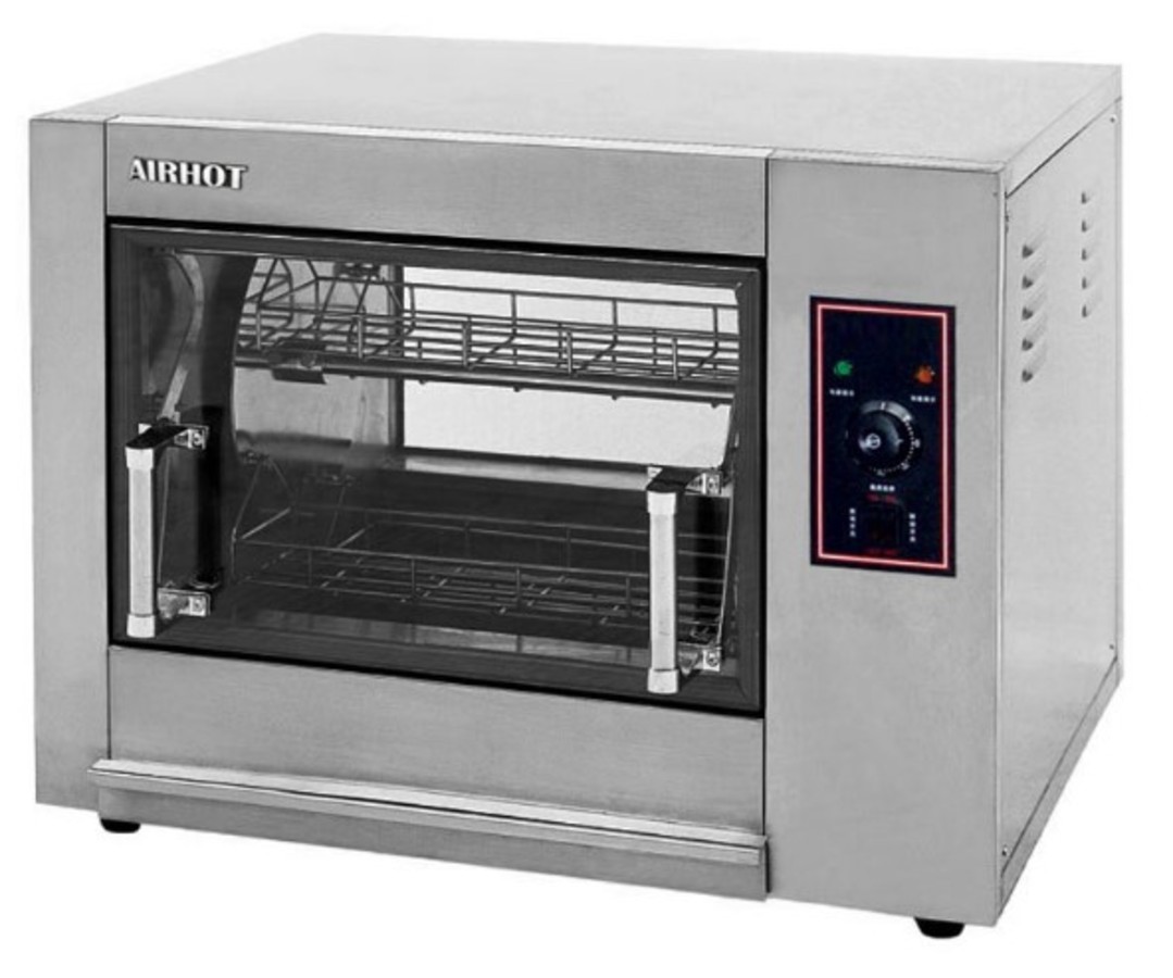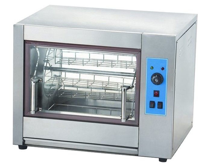 L'équipement alimentaire thermique de ce modèle est conçu pour être installé dans des établissements de restauration, des supermarchés, pour le commerce de rue. Sur le gril, vous pouvez faire frire des poulets, des cuisses ou des ailes de poulet. Processus de cuisson entièrement automatisé. Le corps est en acier inoxydable. Évalué pour 220 volts. La largeur de l'appareil est de 810 mm, longueur - 630 mm, hauteur - 610 mm. Sans emballage, il pèse 60 kilogrammes. Il peut frire 12 poulets en même temps. Verre résistant à la chaleur. La présence de l'illumination. Panneau de commande électromécanique. L'ensemble comprend quatre paniers. Les éléments chauffants supérieur et inférieur sont réglés séparément. Équipement de classe moyenne fabriqué en Chine. Gril carrousel. Le coût de l'appareil est de 26 000 roubles.