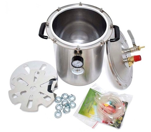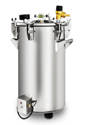 La capacité de ce modèle est de 14 litres. Cette machine est équipée d'un thermomètre et d'un manomètre pour surveiller les niveaux de pression et de température. L'autoclave est en acier inoxydable de 1,5 mm et le couvercle est fixé avec huit boulons à œil.